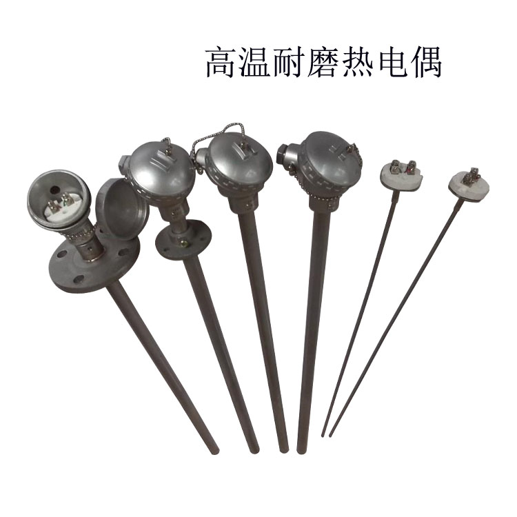 耐磨熱電偶用硫化床鍋爐、磨煤機等強磨損和有震動場合,在高溫下有很好的耐磨性和耐腐蝕性。耐磨熱電偶外護管為耐磨材料制成,測溫元件為鎧裝熱電偶。