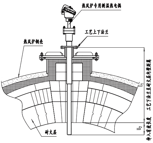 注意:上圖U2指熱風(fēng)爐熱電偶深入熱風(fēng)爐內(nèi)的有效長(zhǎng)度,這個(gè)長(zhǎng)度很重要:深入有效長(zhǎng)度太長(zhǎng)測(cè)量的不是燃熱風(fēng)爐內(nèi)燒區(qū)的平均溫度